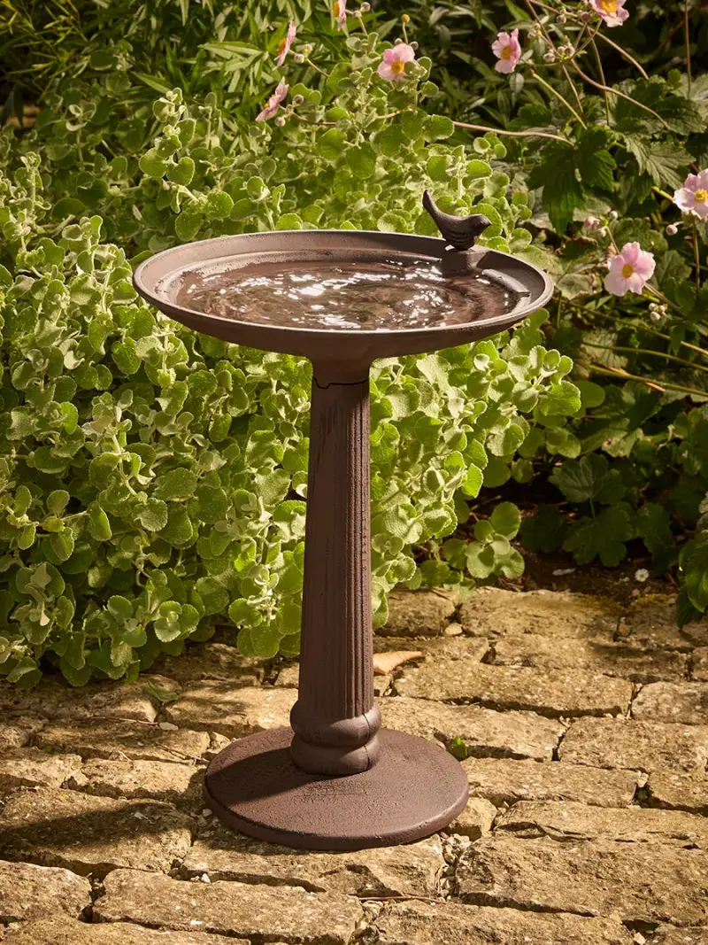 Crafted from sturdy cast iron, this bird bath has earthy tones that blend wonderfully with the natural tones that fill your garden.Held by a leg with gentle rib detailing, the bath has a spiral shape that swirls to meet a sweet bird on the edge of the bath, welcoming little birds into your garden.