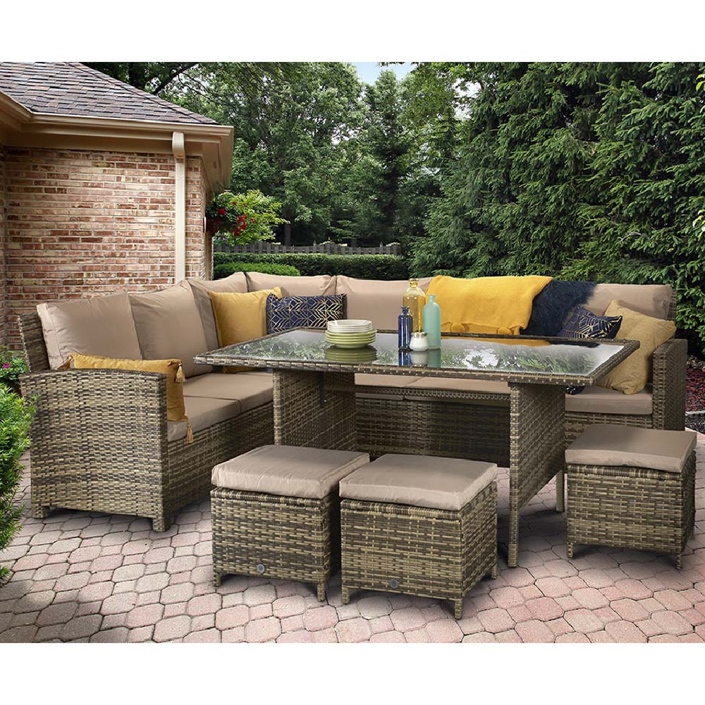 Our review of the Caxias Glass Top Garden Corner Dining Set With 3 Ottomans In Brown