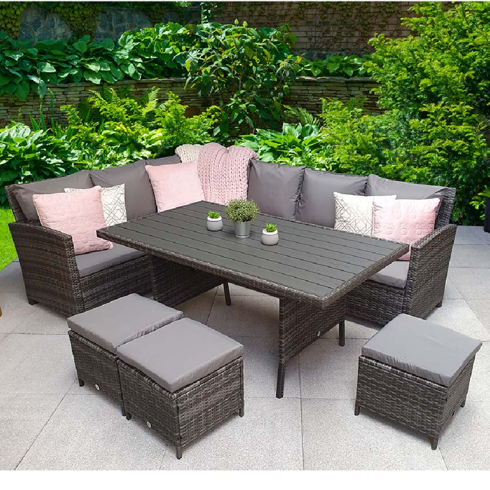 Our review of the Caxias Wooden Garden Corner Dining Set With 3 Ottomans In Grey