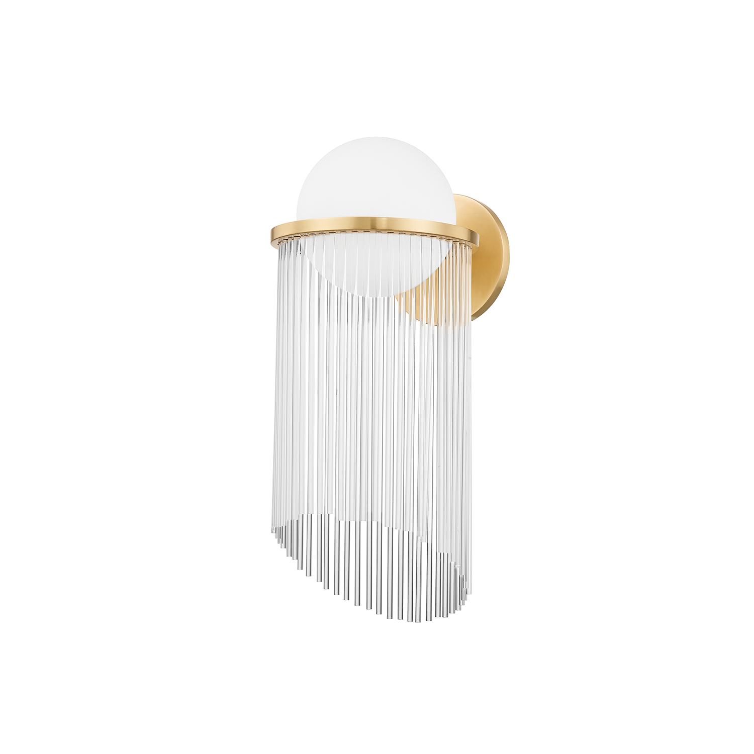 The Celestial wall light in aged brass features angled glass rods and opal globes for a sculptural, vintage-inspired glow. A striking statement for any space. Celestial, Light, Brass - Andrew Martin