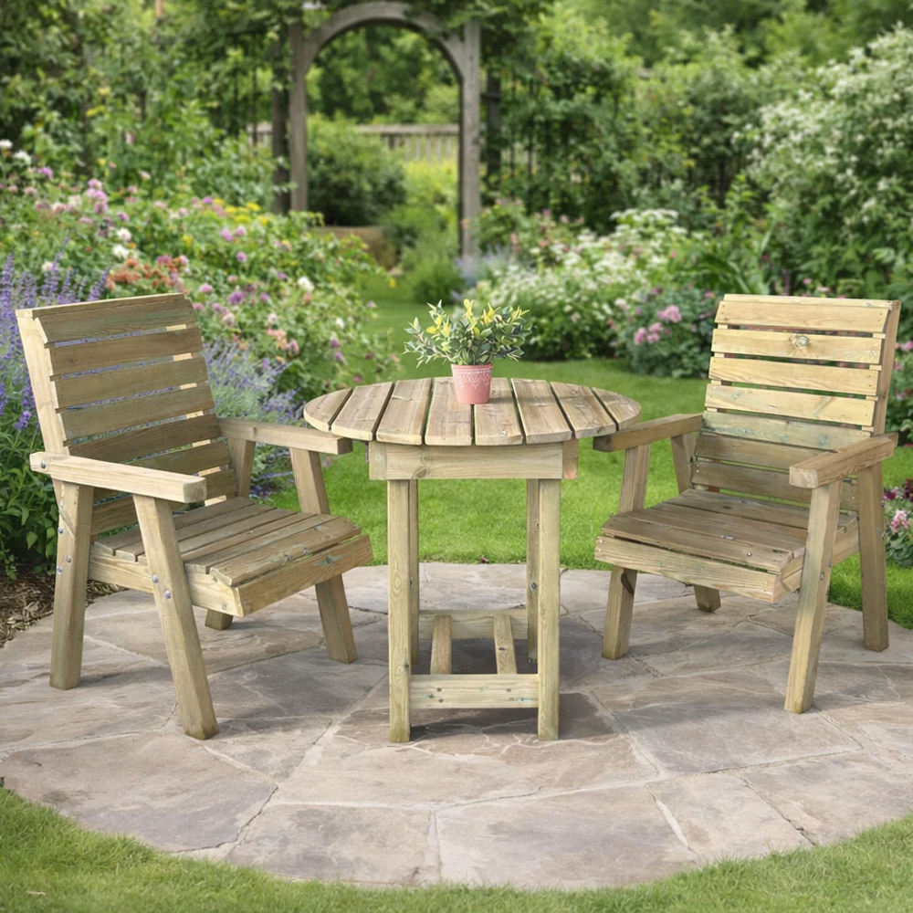 Bring charm and functionality to your outdoor space with the elegant Chatham Garden Wooden Bistro Set In Natural, exclusively from Furniture in Fashion. Designed for compact gardens, patios, and balconies, this stylish 2-seater bistro set creates the perfect setting for relaxed outdoor dining, morning coffee, or evening conversations. Its natural wood finish enhances any garden aesthetic, offering a warm and inviting atmosphere. Crafted from premium pressure-treated timber, this bistro set is built for long-lasting outdoor performance. The sturdy construction, combined with traditional craftsmanship, ensures excellent durability and resistance against weather elements. Featuring a beautifully designed round table and two comfortable armchairs, this set is ideal for both residential and light commercial use, delivering practicality without compromising on style. The Chatham Garden Wooden Bistro Set In Natural by Furniture in Fashion is a perfect blend of durability, style, and space-saving design. Whether for a cosy garden corner or a stylish patio setup, it offers a reliable and elegant outdoor seating solution built to last. FEATURES: Material: Wooden Finish: Natural Set Include: 1 x Bistro Table, 2 x Chairs Made from pressure-treated timber, its designed to resist rot for up to 20 years, ensuring long-lasting use Compact and versatile, this set is perfect for al fresco dining on small patios or balconies The set includes a sturdy 80cm circular table paired with two matching armchairs, offering comfort for relaxing with a partner, friend, or family member It's also a great fit for commercial spaces like cafes, pubs, schools, golf clubs, and parks, adding a durable and stylish touch to any setting Made from premium, pressure-treated FSC-certified timber to resist rot for up to 20 years with proper care 80cm table diameter Solid and sustainable Swedish Redwood Pressure-treated timber Available at an affordable price Images shown are for I