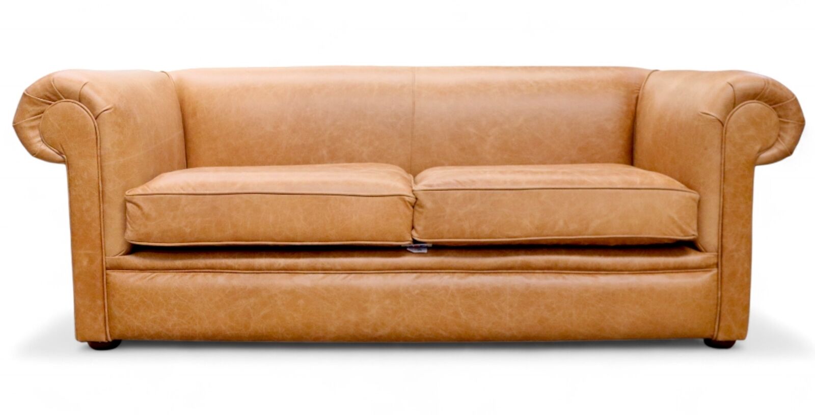 HANDCRAFTED IN ENGLAND Bring timeless elegance and comfort into your home with this Chesterfield-inspired sofa, upholstered in genuine tan leather. With its classic rolled arms, deep cushions, and rich texture, this sofa offers both sophistication and relaxation. Premium genuine leather upholstery Chesterfield-style rolled arms for a refined look Supportive, plush seat cushions for lasting comfort Neutral tan color that complements any interior d cor What Is Old English Leather Old English is aniline leather, tanned to ensure a pleasing distressed or aged finish from new. Extra fat liquors are applied during tanning, to give the leather a slightly waxy feel. These leathers are designed to allow the natural marking variations of the leather to show through to the finish coat. Pull-up leathers do not have a consistent colour density across the whole hide. They are designed to change colour and sheen when pulled or stretched. They are not as colour fast as pigmented hides and…
