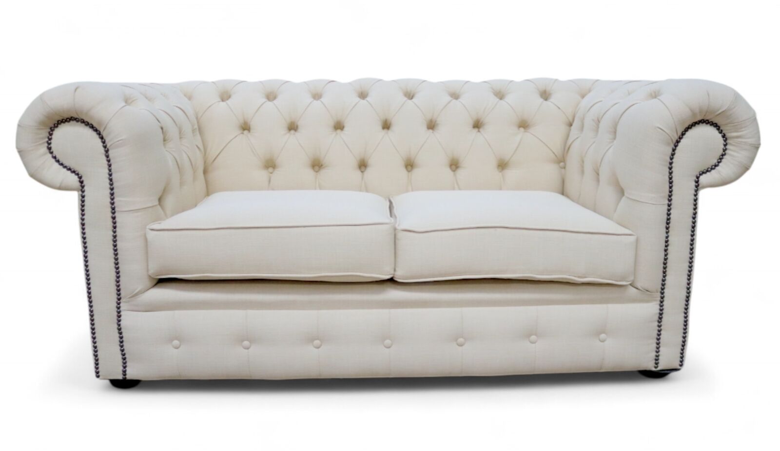HANDCRAFTED IN ENGLAND The Chesterfield Classic Sofa. The Chesterfield Linen Sofa with it's unique Low Back Style, Deep Buttoned Arms and Back complemented with a Buttoned Front Border. The Scroll Fronted arms on the Chesterfield Leather Sofa are attractively embellished with lines of individual stud nails. An undoubted winner in any room from the cottage to the boardroom. A classic of its kind ;Traditional Vintage British Style. Handmade in Linen - Handmade in Luxury Linen - Non Tropical Screwed and glued hardwood frame made in house - Upholstered and buttoned by craftsmen - Real wood Bunfeet - Hand studded - From construction of the frame to filling in the cushions all is completed in house. - Individual seating options (Soft, Medium, Firm) - Payment Option 50% Deposit Rest of Balance On Delivery - FREE Swatch Service - 12 Month Manufacturers Guarantee - 10 Year Manufacture Guarantee on Framework - Manufactured In England - Worldwide delivery Available 2 Seat Sofa Dimensions…