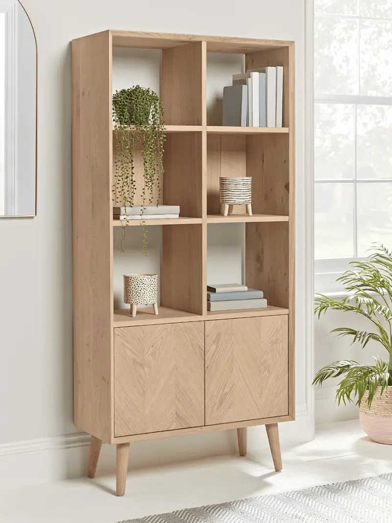The perfect addition to any neutral or Scandi inspired interior, our stylish Chevron Oak Display Unit features four slender, tapered legs and a subtle chevron finish.Each piece has six spacious, open shelves with plenty of room for displaying greenery, books and ornaments. Below are two generous cupboards with push-click closing mechanisms and adjustable interior shelves for flexible storage. Crafted from beautiful blonde oak, this piece will help you create a serene, laid back aesthetic in your home.Complete your entire look with other pieces from our Chevron Oak Collection.
