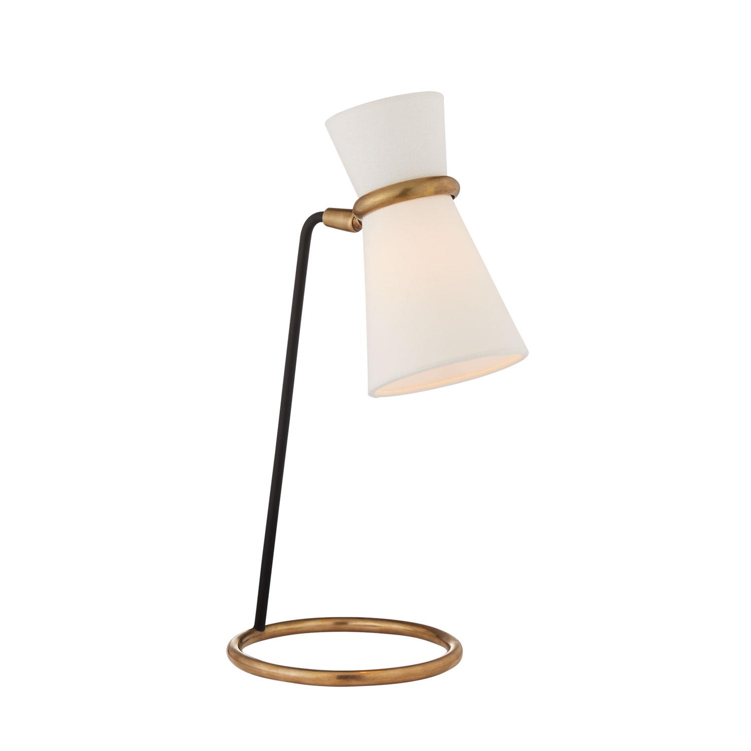 A sculptural table or desk lamp with a contrasting black and antique brass stand in a slender silhouette. Sleek and subtle design by AERIN, for your home. Clarkson Table Lamp Black, Desk Lamp, Antique Brass/Black - Andrew Martin