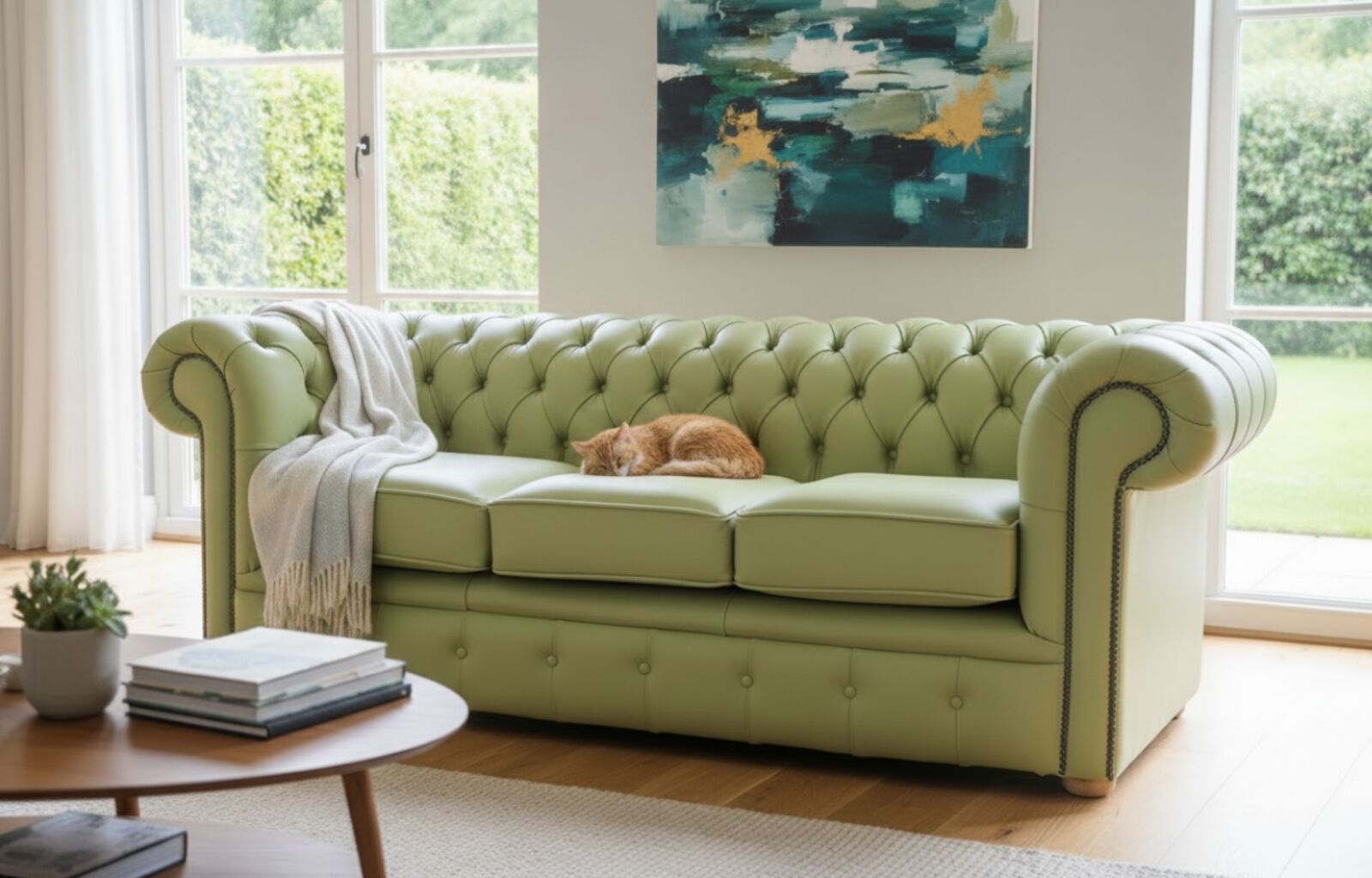 Bring sophistication and charm into your living space with this luxurious green Chesterfield leather sofa. Handcrafted with care and upholstered in high-quality genuine leather, this sofa boasts a timeless tufted button design, rolled arms, and a sturdy hardwood frame for lasting durability. Elegant pistachio green finish a bold yet calming centerpiece Deep-button tufting and rolled arms for classic Chesterfield style Nailhead trim accents and detailed craftsmanship Solid wood frame & legs ensure long-lasting use Removable, plush seat cushions for maximum comfort Easy to clean and maintain Our Premium Leather is a high quality grain hide which has been carefully milled to bring out the natural look of the leather. It is finished with a super soft pigmented topcoat, and has a smooth silky touch. No artificial grain print has been used, so the hide has a smooth natural look with a variation in grain density. Premium Leather hides offer excellent light fastness and stain…