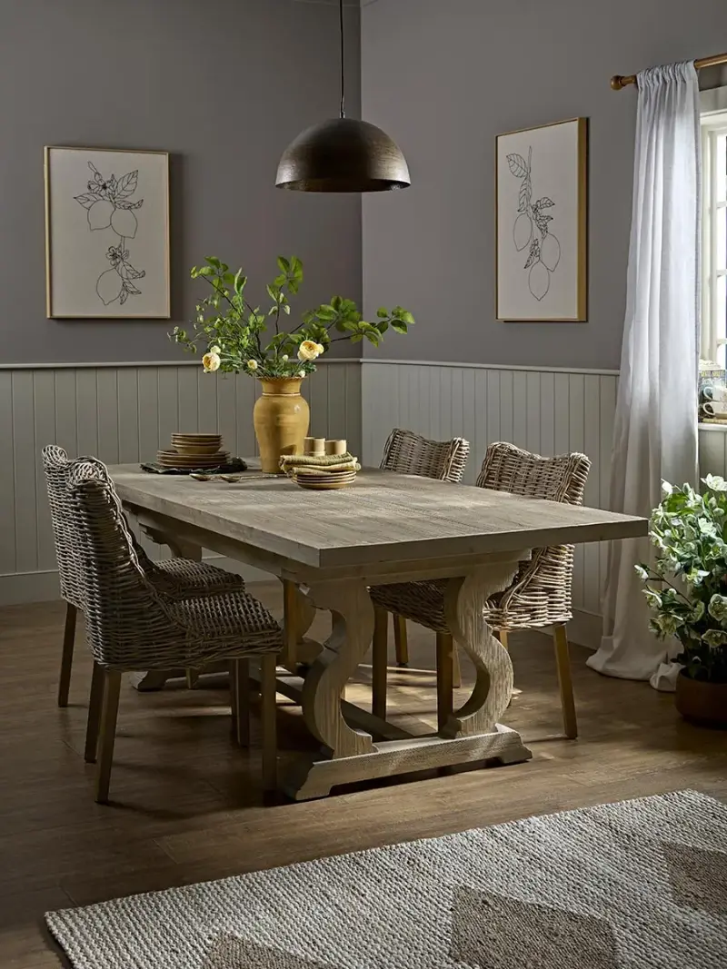 For a dining space that encapsulates our English Rustic trend, place our Coimbra Dining Table in your space.With intricately carved farmhouse-style legs, this dining table features a chunky tabletop that shows off the natural patina of the wood beautifully.