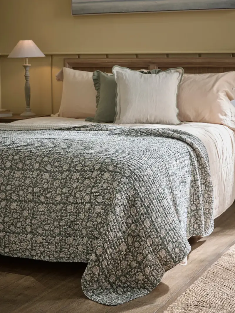 Bring the cottagecore vibe to your home with our Collette Quilted Bedspread.On a gorgeous sage green base, a delicate floral pattern sits in a patchwork style on the quilted throw, creating a sweet addition to your home.The lively pattern creates an eclectic and individual look that is the perfect fit in our English Rustic trend.Place on the end of your bed to bring extra warmth and comfort on those colder and cosier nights.