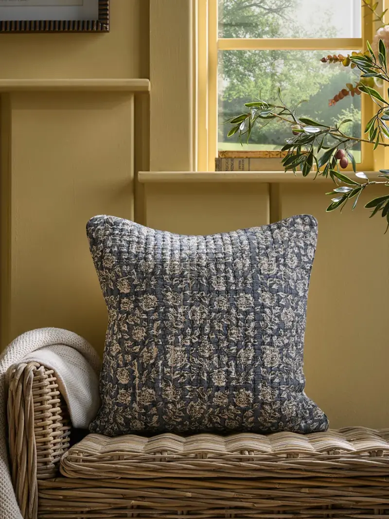 Bring the cottagecore vibe to your home with our Collette Cushion. On a blue base, a delicate floral pattern sits on this cotton quilted cushion, creating a sweet and soft addition to an armchair, sofa, or even bed. The lively pattern creates an eclectic and individual look that is the perfect fit in our English Rustic trend.