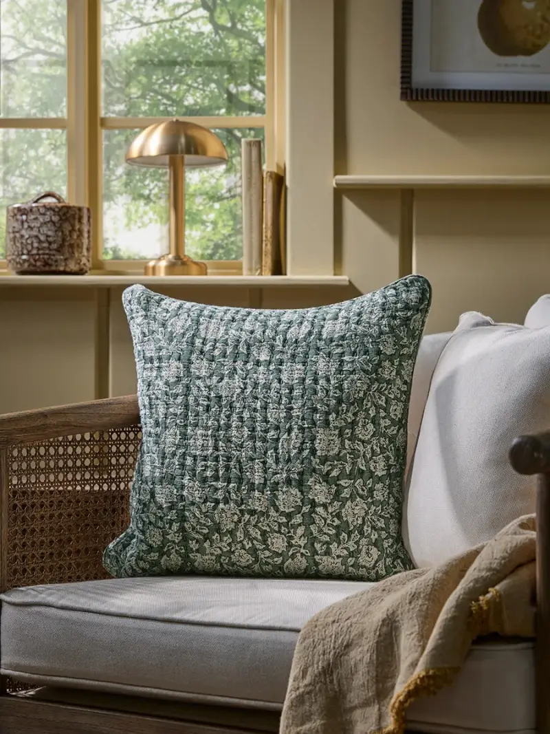 Bring the cottagecore vibe to your home with our Collette Cushion.On a sage green base, a delicate floral pattern sits on this cotton quilted cushion, creating a sweet and soft addition to your home. The feather-filled padding offers a plump spot to land, providing the ultimate comfy spot in your living space or bedroom.The lively pattern creates an eclectic and individual look that is the perfect fit in our English Rustic trend.