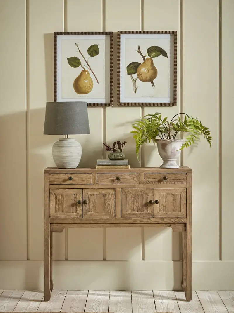 Crafted from reclaimed oak, this console table is as stylish as it is practical.A sturdy, angular frame shows off the natural patina of the oak and holds two cupboards and three drawers, meaning there is ample storage space to keep your home looking neat and tidy.Finished with contrasting metal handles, this console table is versatile enough to blend into any interior scheme.