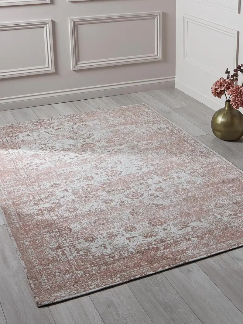 With a sense of big-house heritage by a clever 'aged' pattern design, our large cotton chenille carpet comes with all the inherited grandeur of old-world elegance. The beautiful warm pink and plaster tones of our handwoven rug open out to the hint of a traditional Persian patterning, broken in degrees to suggest a piece that has lived.Our large rug is cosy underfoot and will dress your space with romanticism, and a little drama.Click here to view our useful Rug Buying Guide.