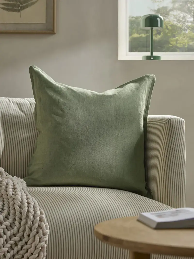 Perfectly simple in style, this cushion cover in earthy sage green tones adds a soft pop of colour to your home, whilst providing a sumptuously soft place for you to sink into each and every day.Made from a blend of cotton and linen, it is the perfect finishing touch to either a sofa or armchair.This cushion cover is suitable for a 58cm x 58cm cushion pad which is available separately.