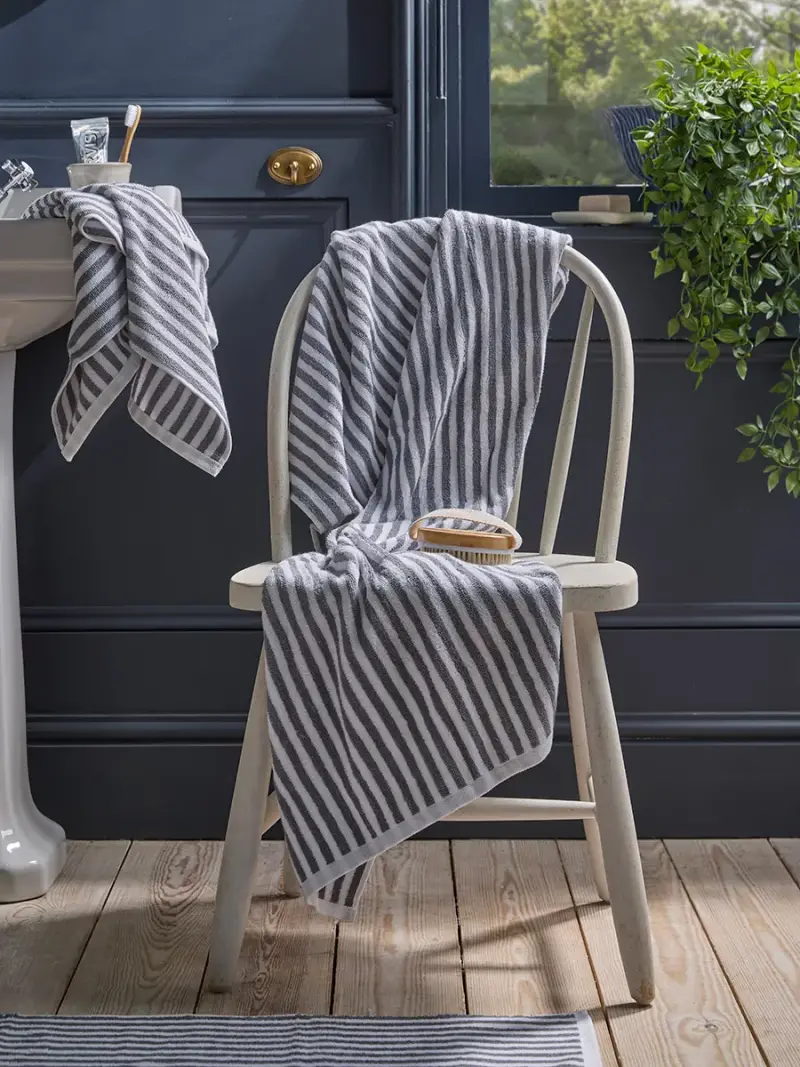 Wrap yourself in the cosy touch of our cotton striped bath towel.Simple grey stripes create a timeless finish that works in a variety of bathroom styles and creates a beautiful finishing touch to your towel rail.