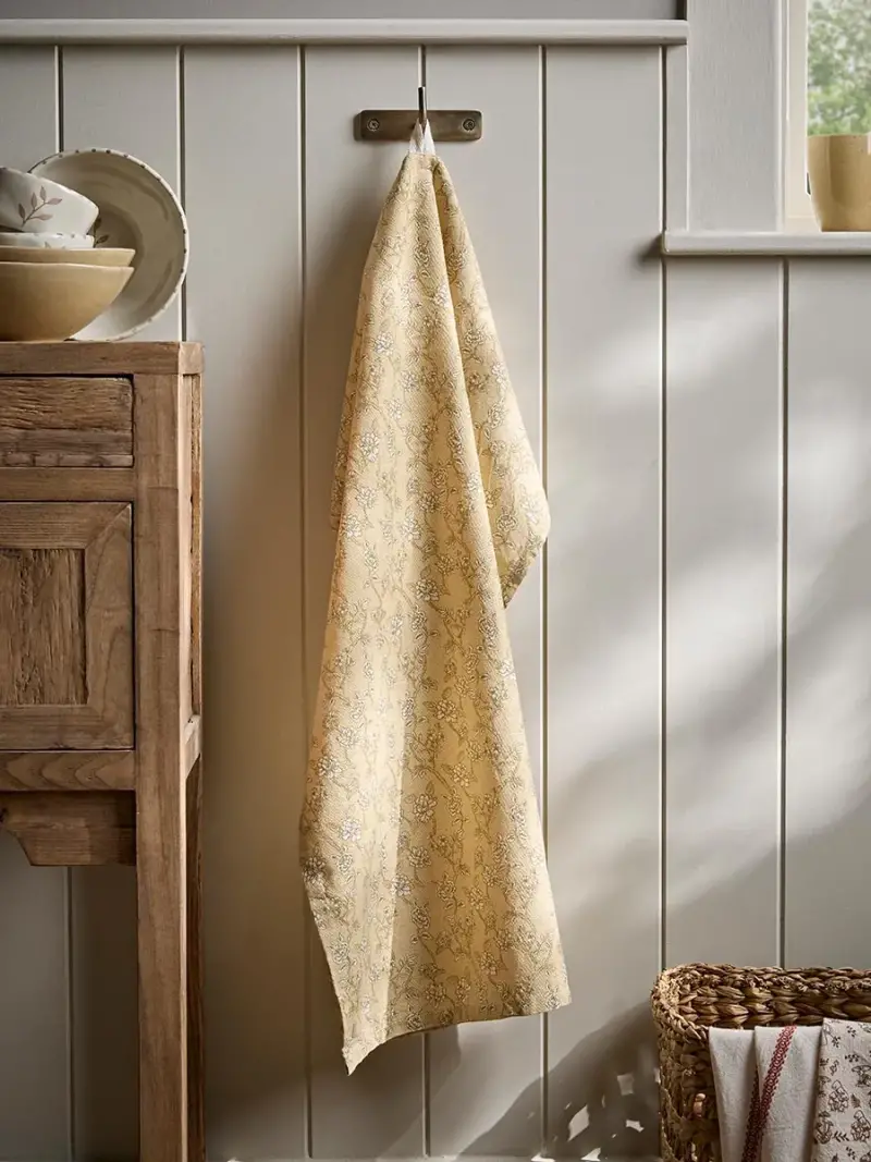 Full of cottagecore charm, this delightful butter yellow tea towel is a perfect addition to any kitchen. Its design features a beautiful trailing floral pattern that evokes a sense of rustic elegance and warmth. The soft, buttery hue adds a touch of sunshine to your space, making it both functional and aesthetically pleasing. Designed for everyday use, this tea towel effortlessly combines practicality with a whimsical, nature-inspired aesthetic.