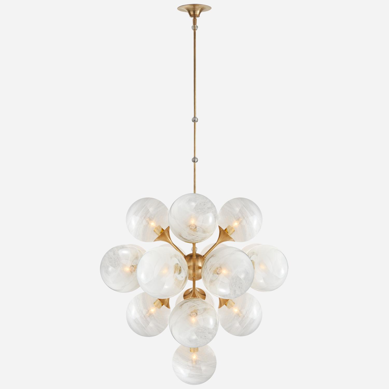 Tiered chandelier in antique brass This chandelier brings both illumination and impact to a large space, with pearl like orbs of light supported by wonderfully curved tulip shaped arms. A contemporary spin on a traditional style, Cristol is available as versions with 10 or 17 globes. Complete the look with the Cristol Single Wall Light, Cristol Double Wall Light and Cristol Flush Mount. Cristol Chandelier Brass, Chandelier, Large, Hand-Rubbed Antique Brass - Andrew Martin