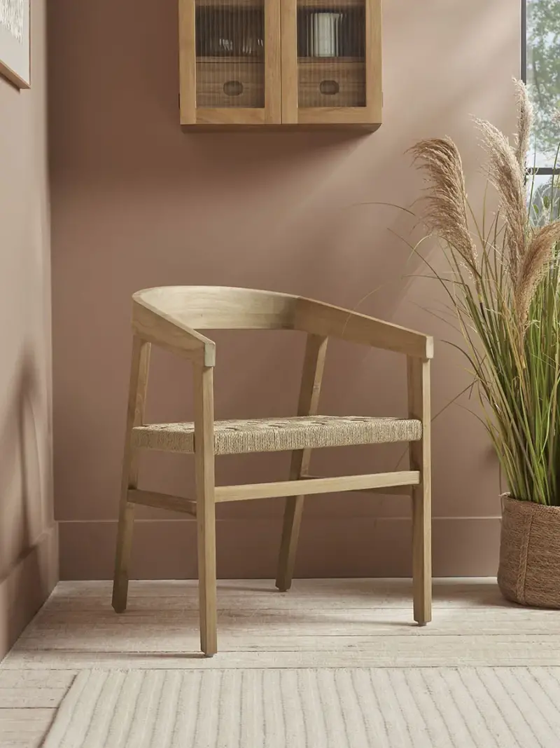 With a simple light teak frame, this dining chair has curved sides with slightly angular edges for a clean and modern finish.The seat pad has a woven checkered pattern, creating a unique visual design that adds a touch of neutral interest to your dining space.