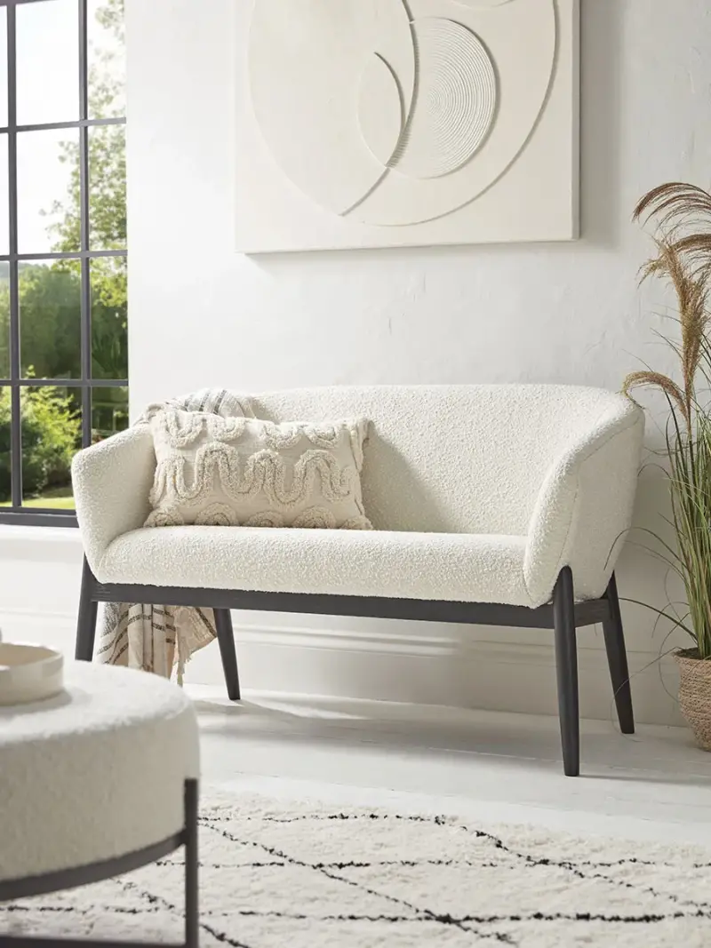 Snuggle up in our luxurious bouclé sofa. The soft curved edges and light toned fabric make it the perfect neutral addition to any space. Striking black legs contrast beautifully to add a contemporary feel to the piece.Pair with our bouclé footstool, in small or large.