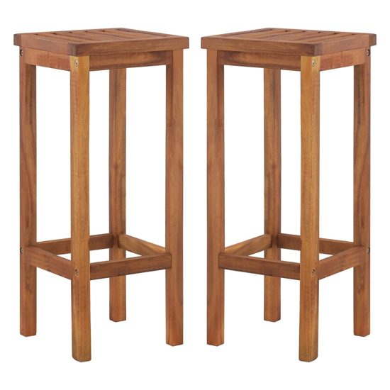 This wooden bar chair set will make a great addition to your outdoor living space. FEATURES : Material : Solid acacia wood with an oil finish Finish : Brown Made of solid acacia wood, the chair set is weather resistant and highly durable The footrests add to the set's seating comfort The oil-finished surface is easy to clean with a damp cloth Assembly is easy Delivery includes 2 bar stools Available at an affordable price Images shown are for illustration purpose only DIMENSIONS : Height : 74cm Width : 30. 5cm Depth : 30. 5cm