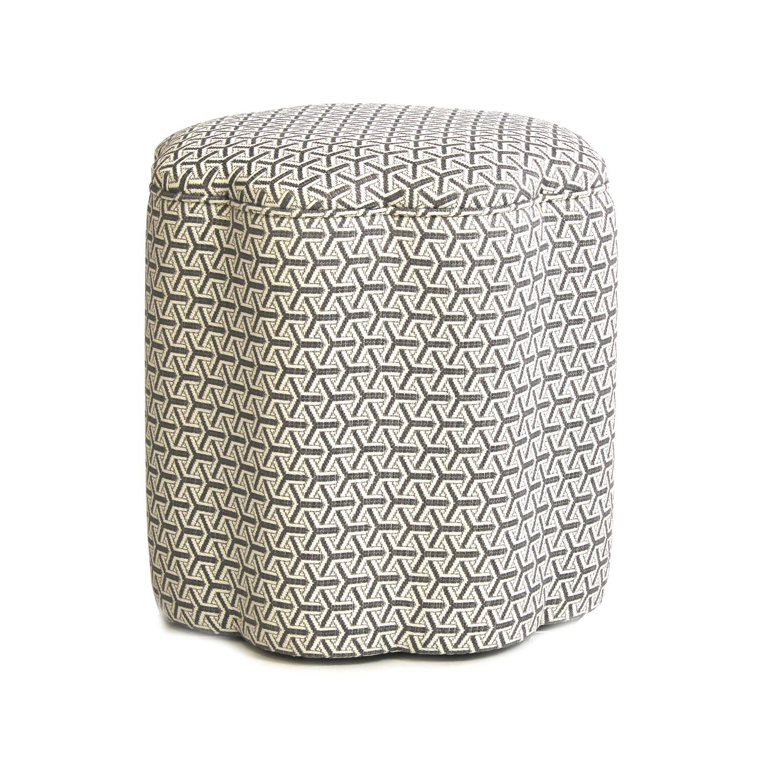 Geometric upholstered ottoman A classic with a twist, our Daisy ottoman is defined by its scalloped edge and dainty size. Upholstered in our Monte Storm fabric, designed with Sophie Paterson Interiors, this piece brings instant character and versatility to a space, taking shape as an extra seat, a footstool or even a side table. Image courtesy of georgieroseinteriordesign Daisy Ottoman Monte Storm, Ottoman - Andrew Martin Cotton