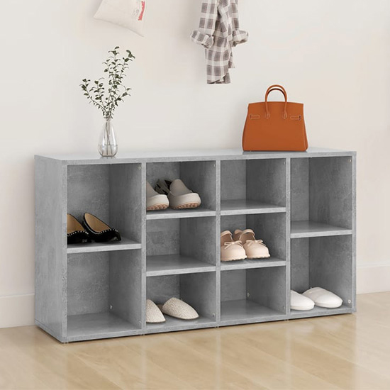Darion Wooden Shoe Storage Bench With 10 Shelves In Concrete Effect, Keep your shoes well organised and always at hand with this shoe bench! It can also be used as a TV cabinet. FEATURES : Material : Engineered Wood Finish : Concrete Effect The shoe cabinet features 10 Shelf, offering ample space to store your shoes The sturdy top is ideal for keeping your essentials or other decorative items Additionally, the shoe organiser is easy to clean with a damp cloth Available at an affordable price Images shown are for illustration purpose only DIMENSIONS : Height : 54. 5cm Length : 103cm Width : 30cm