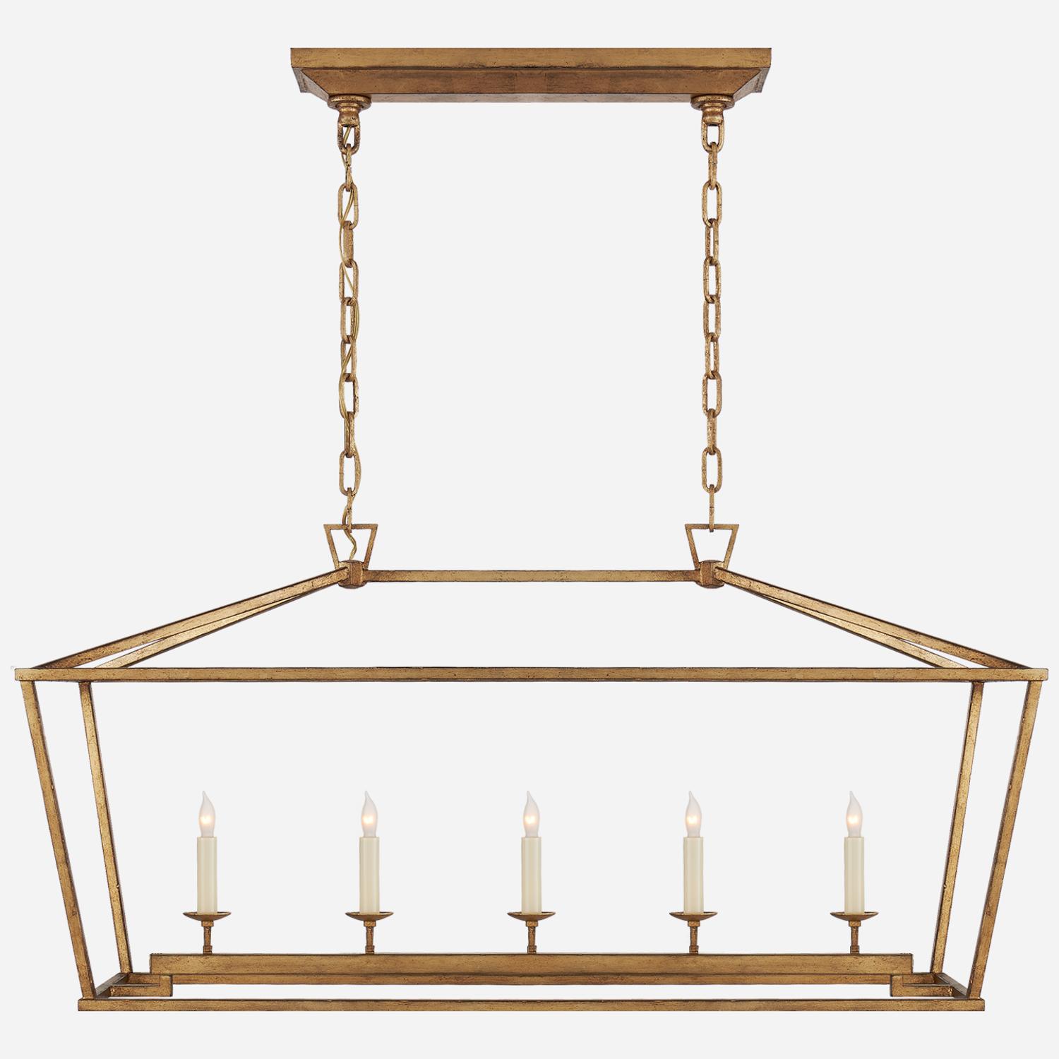 A classic linear lantern pendant light Darlana, by Chapman & Myers, brings classical proportions into balance. An open steel framework with slightly offset corners and distinctive triangular top loop detail blends traditional and minimalist and adds refinement to the classic lantern form. Geometric shapes add modern structure without overwhelming more causal interiors. Darlana Medium Iron, Linear Pendant Light, Medium, Gilded Iron - Andrew Martin