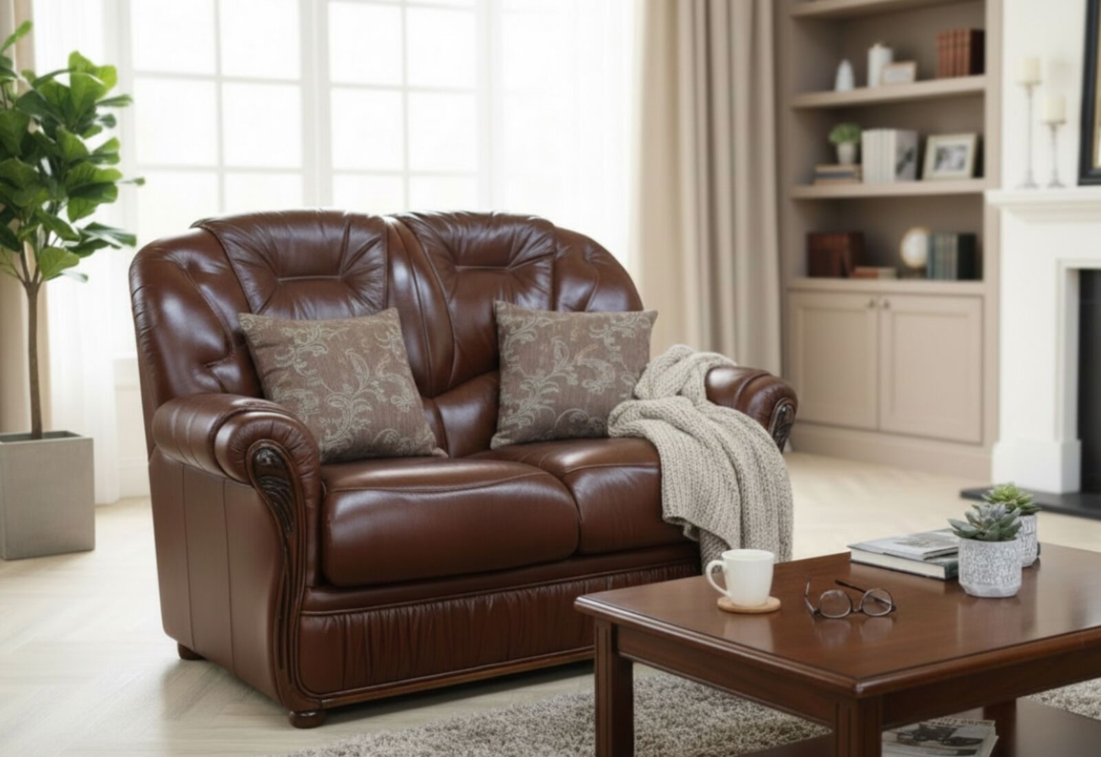 Upgrade your living space with the timeless elegance of the Debora 2-Seater Sofa, crafted from 100% genuine Italian leather in a rich Tabak Brown finish. This luxurious settee combines traditional craftsmanship with modern comfort, making it the perfect centerpiece for both classic and contemporary interiors. Premium Genuine Italian Leather: Smooth, soft-touch leather with natural grain for a rich and luxurious feel. Classic Chesterfield-Inspired Design: Features deep cushioning, sculpted arms, and tasteful stitching details. Solid Hardwood Frame: Built to last, with sturdy legs and intricate carved wood accents. Plush Padded Seats & Backs: High-density foam cushioning offers exceptional comfort and support. Compact 2-Seater Size: Ideal for apartments, lounges, offices, or cozy corners. 2 Seater Sofa Dimensions : H 98cm x D 82cm x W 133cm apprx. We understand that purchasing furniture is a household decision. Therefore in order to make this stress free, we…