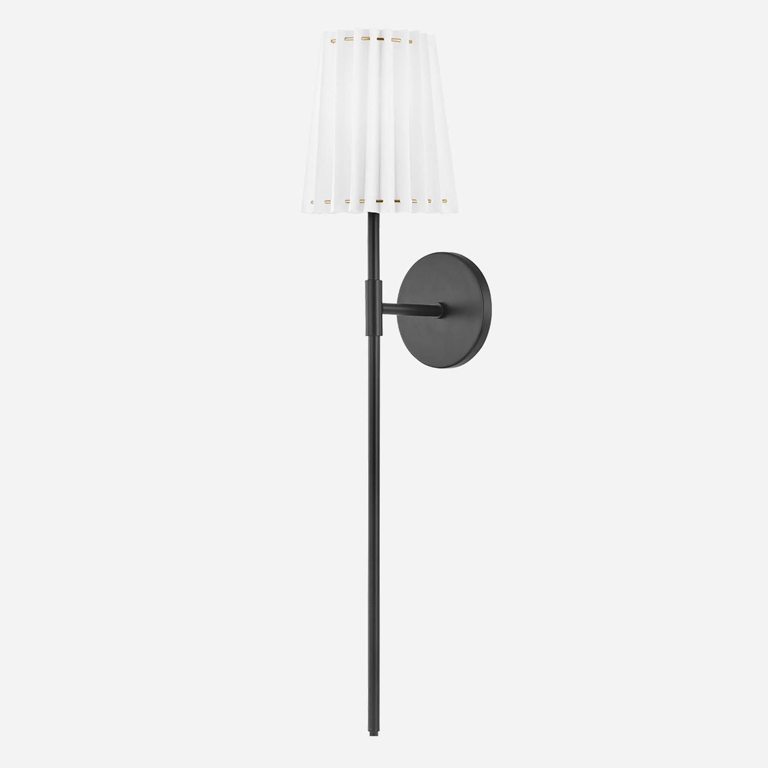 With clean lines and playful pleats, the Demi Wall Sconce blends whimsy with modernism in its torch-style silhouette. In a highly intentional design, its metal frame is elegantly threaded through each pleat of the shade. Demi Large Wall Light, Wall Light, Solid Black - Andrew Martin