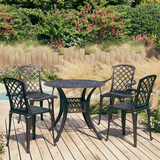 Introducing the Denver Cast Aluminium 5 Piece Bistro Set in Black from Furniture in Fashion. Create a charming outdoor dining area with this versatile and stylish bistro set. The set includes four chairs and a round table, all made from durable cast aluminium with a sleek black finish. Designed to withstand the elements, this set is perfect for enjoying meals or drinks in your garden, patio, or balcony. The chairs feature comfortable seats and backrests, while the round table provides ample space for dining or entertaining guests. With its elegant design and sturdy construction, the Denver Cast Aluminium 5 Piece Bistro Set adds a touch of sophistication to any outdoor space. Upgrade your outdoor living experience with this high-quality bistro set. Shop now and elevate your outdoor entertaining game with this beautiful and functional set. FEATURES : Material : Cast Aluminium Finish : Black This bistro set, made of cast aluminium, provides a comfortable seating experience for you and your guests The outdoor chairs and table, made of cast aluminium, are both sturdy and durable The rust-resistant and weather-resistant material makes the furniture set ideal for outdoor use The beautiful patterns make the bistro set an elegant addition to your outdoor space Additionally, the coffee table has an umbrella hole that can perfectly accommodate your umbrella to protect you from sun or rain Note: In order to extend the life of your outdoor furniture, we recommend you to clean it regularly and do not leave it outdoors without protection unnecessarily If possible, store in a cool, dry place indoors If the product is stored outdoors, protect it with a waterproof cover Wipe and dry the excess water or snow from flat surfaces after a rain or snowfall Allow sufficient air circulation to avoid moisture-related damage Assembly required: Yes Available at an affordable price Images shown are for illustration purpose only TABLE DIMENSIONS : Height : 740mm