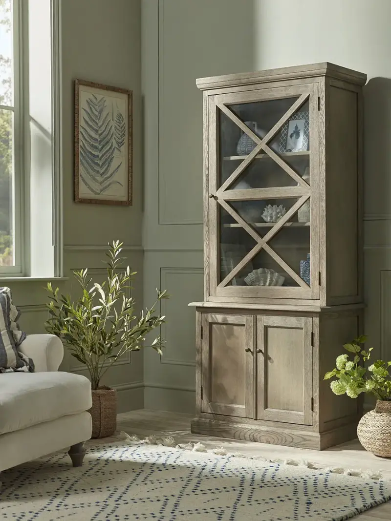 With a cute and quaint country style, this display cabinet creates a wonderful feature in your home. Ideal for keeping clutter at bay, the cupboard space is the perfect place to store your finest dinnerware. And with shelving above the cupboard, a glass fronted door with farmhouse style crosses allows this piece to sit confidently in a relaxed scheme. The washed oak frame has a lightness to it, perfect for a home that embraces our French Blue trend.