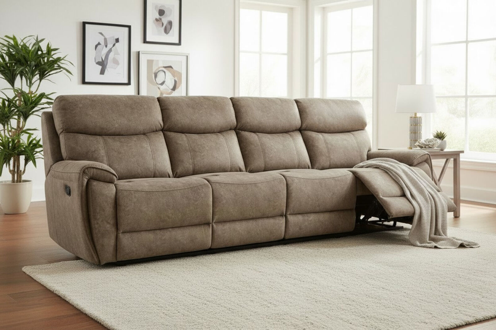 Dino 4 Seater Reclining Sofa Mink Fabric Cosy up with a good book or chillout in front of the TV with this luxuriously comfy and stylish recliner sofa Sink into a world of comfort with the Dino soft fabric recliner sofa. With USB Charging Port. Designed with roomy seating and smooth reclining, this piece offers all of the necessities for relaxation. It features a durable premium quality Fabric upholstery Both End Seat Electrically Recline + USB Charging Port - Both End Seat Recline - Durable - Breathable - Hard Wearing - Easy to Clean - Comfortable sofas that will fit through a narrow hallway/doorway. If you thought you were limited when it comes to finding a new sofa for narrow hallways/doorways, we hope you ve now realised you do have choices, and plenty of them! Please feel free to speak to us via live-chat, call, email or live video call for further info or any concern. 4 Seater - Width 290cm x Depth 102cm x Height 103cm Dino 4 Seater Reclining Cinema Sofa Silver…