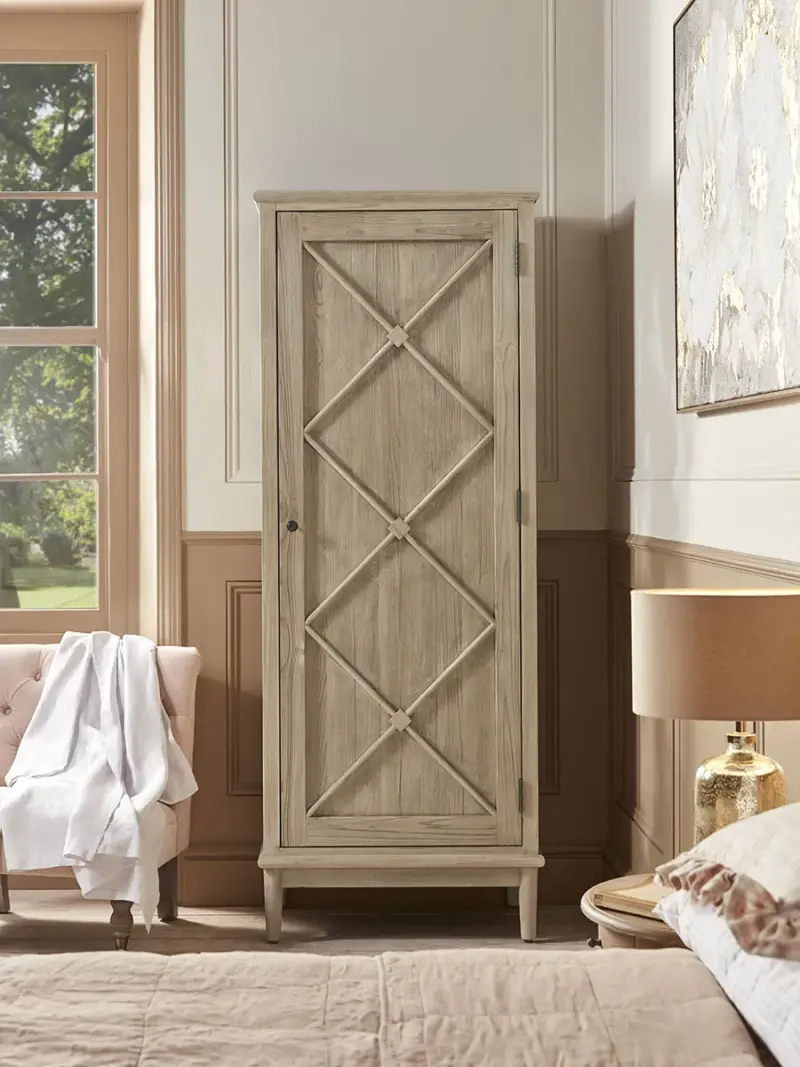 Ideal for smaller spaces, our Dione Wardrobe is crafted from recycled pine inviting a soft and gentle look.Elegant moulding creates a diamond pattern across the door, whilst the black hardware adds a modern finish to the wardrobe, allowing it to blend wonderfully in a variety of interior schemes.The inside features a hanging rail and shelf that keeps your space tidy for a restful and restorative bedroom.