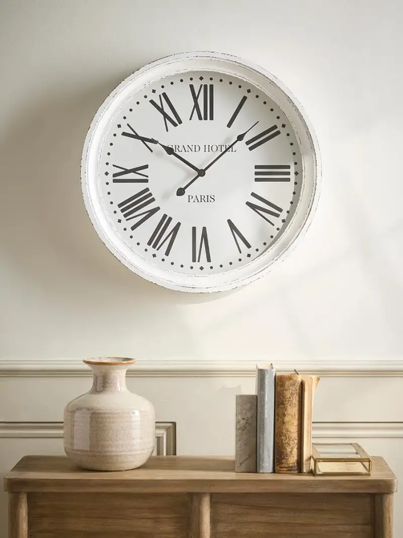 With a traditional Roman numeral clock face, this wooden clock is painted white with a distressed finish, creating a gently aged look, the perfect addition to our Faded Elegance trend.