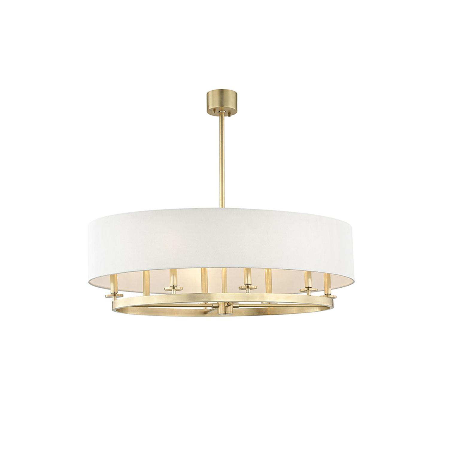 This sophisticated pendant comes in an oval wheel shaped design softened by a wide drum shade in off-white linen. This simple and elegant piece works especially well in neutral, calm spaces. Durham Oval Pendant Brass, Ceiling Light - Andrew Martin
