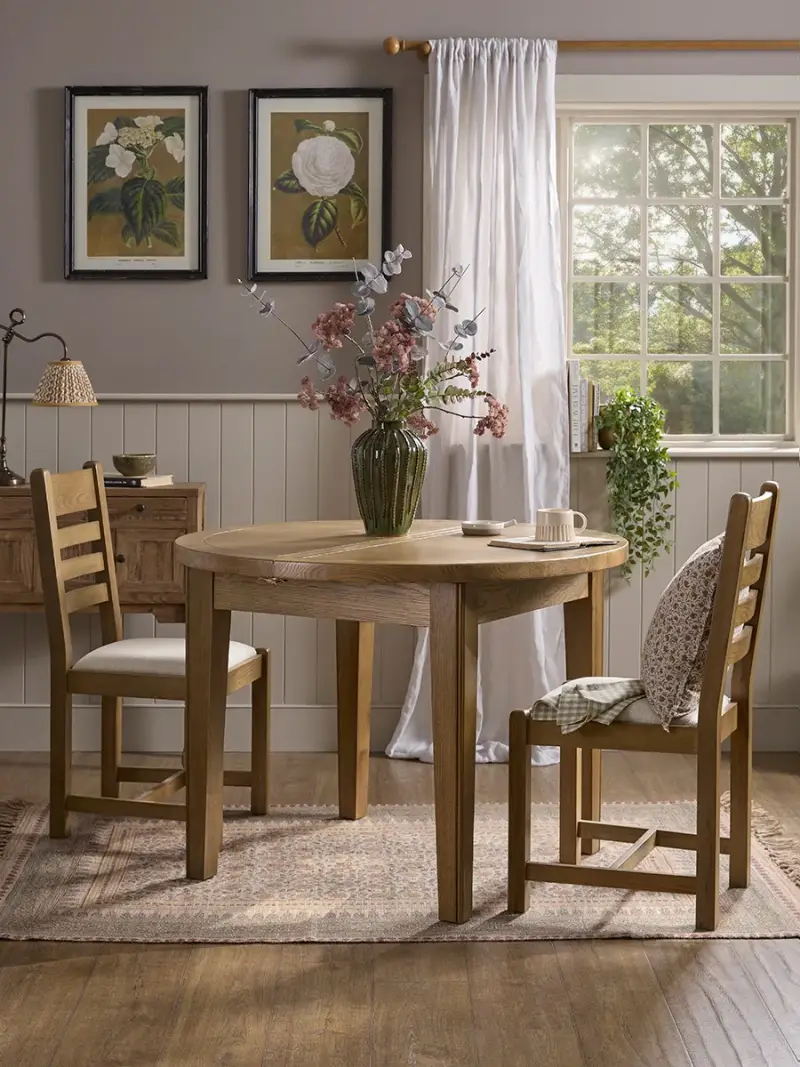Bring timeless warmth and versatility to your dining space with our Effi dining table. Crafted from beautifully grained wood, its softly rounded top and sturdy legs create a classic silhouette that feels both welcoming and refined. The clever extending design allows the table to expand effortlessly, making it ideal for everyday meals as well as hosting friends and family when extra space is needed. Perfect for kitchens or dining rooms, this table combines practical functionality with understated elegance, offering a flexible centrepiece that adapts easily to your home and lifestyle. Pair with our Effi dining chairs for a cohesive look.