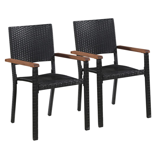 These poly rattan dining chairs with armrests combine style and functionality, and will become the focal point of your garden or patio. FEATURES : Material : PE rattan + acacia wood armrest + powder-coated steel frame Finish : Brown, Black Thanks to the water-resistant PE rattan, the chairs are easy to clean, hard-wearing and suitable for daily outdoor use The powder-coated steel frame also brings super stability and ensures their excellent durability The garden chairs are easy to assemble Note: We recommend covering the dining chairs during rain, snow and frost for its best service to last Easy to assemble Available at an affordable price Images shown are for illustration purpose only DIMENSIONS : Height : 88cm Width : 56cm Depth : 55cm Seat Width : 46cm Seat Depth : 46cm