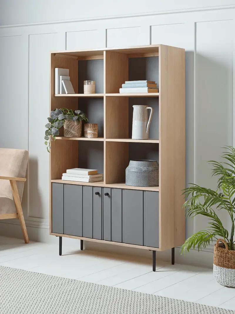 A gentle fusion of Scandi style with Japanese minimalism our Elise Shelf Unit is perfect for contemporary homes. Natural oak is quietly offset by grey painted doors which have been routed to create the effect of folds in the wood. The back wall of the shelves have the same mid-grey tone for unity. Six boxy shelves sit on top of two cupboards, providing display space for books and decorative pieces, as well as storage for more practical items in your living space.
