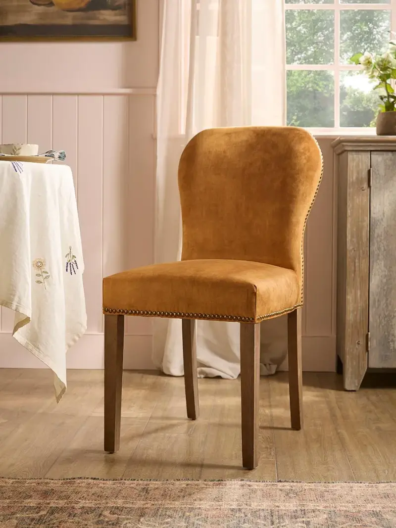Inspired by the timeless design of a classic Parsons chair, this velvet-upholstered dining chair seamlessly combines luxurious aesthetics with exceptional comfort for your dining area. Elegantly supported by plain oak legs and featuring a high, rounded back, the chair's sole embellishment is the brass stud detailing along the upholstery's edge. This subtle accent ensures the rich, golden hue of the velvet fabric remains the focal point.