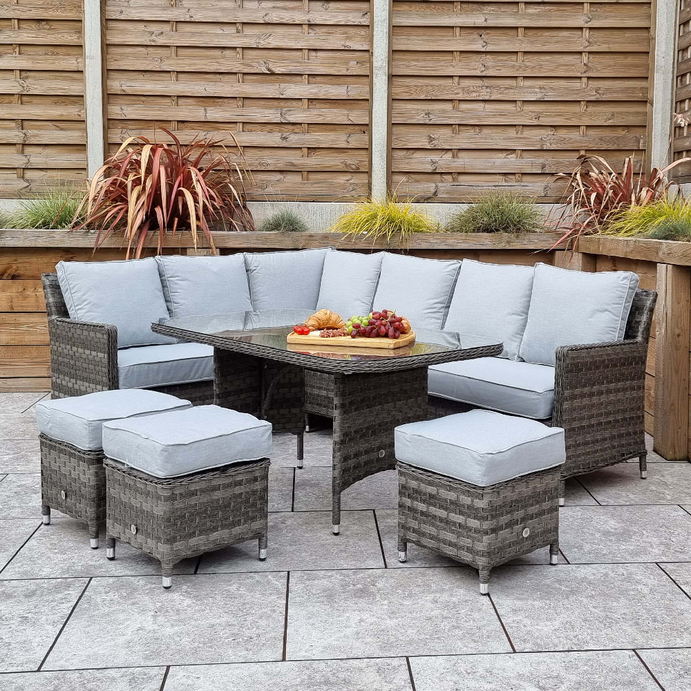 Our review of the Enola Glass Top Garden Dining Set With 3 Ottomans In Grey