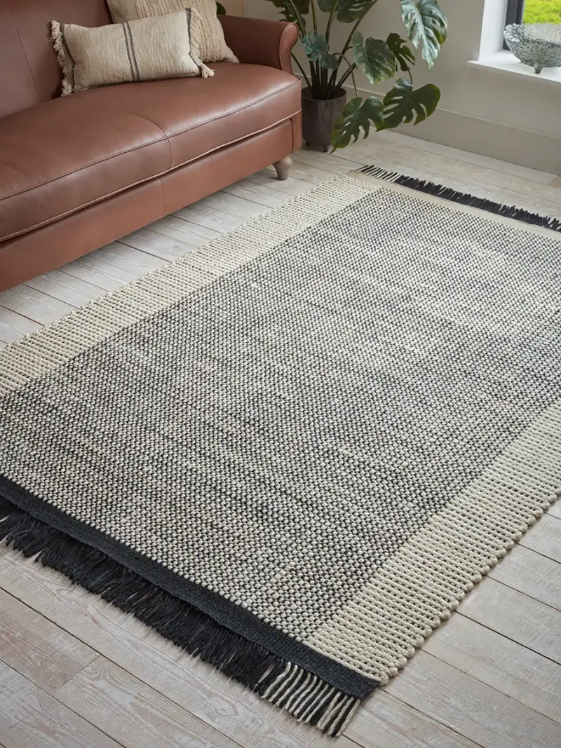 Crafted from luxurious wool, our supersoft Erie Rug provides beautiful contrast to your space, adding a touch of modernity and comfort for you to bury your toes into.With black tassel edges and black weaving on a neutral base, this tiny criss cross pattern adds texture and warmth to this rug.With style and simplicity in design and colour, it is easy to create a cohesive with our Erie Rug look through several rooms and styles.
