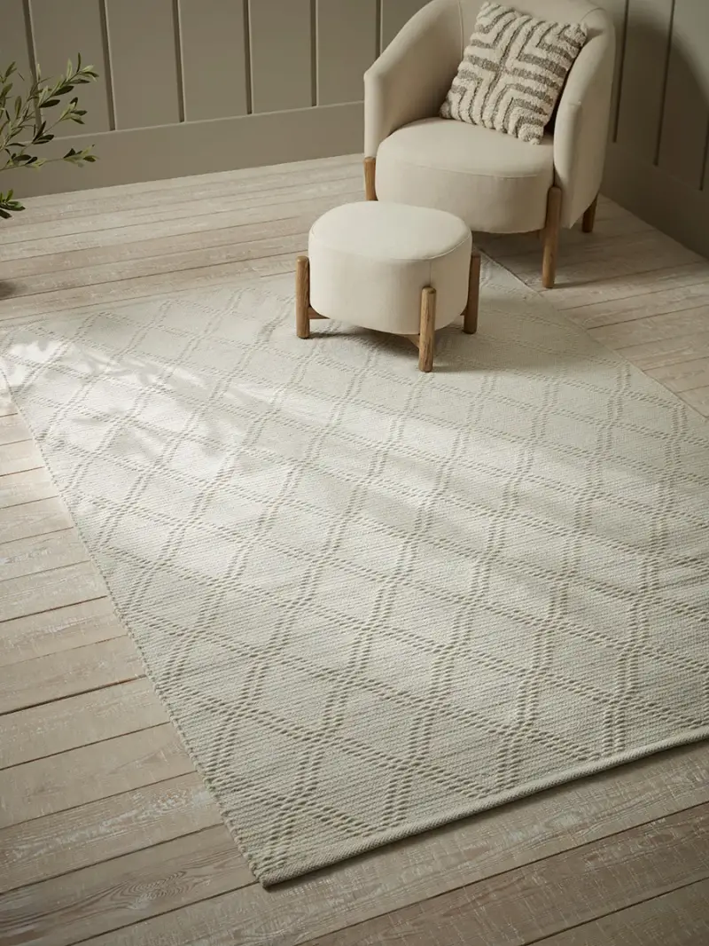 A diamond geometric pattern is gently woven into a neutral woolen rug, for a cosy and snug feel underfoot.Place our Etna Rug in your home for a warming welcome and to add some textural detailing to your home.