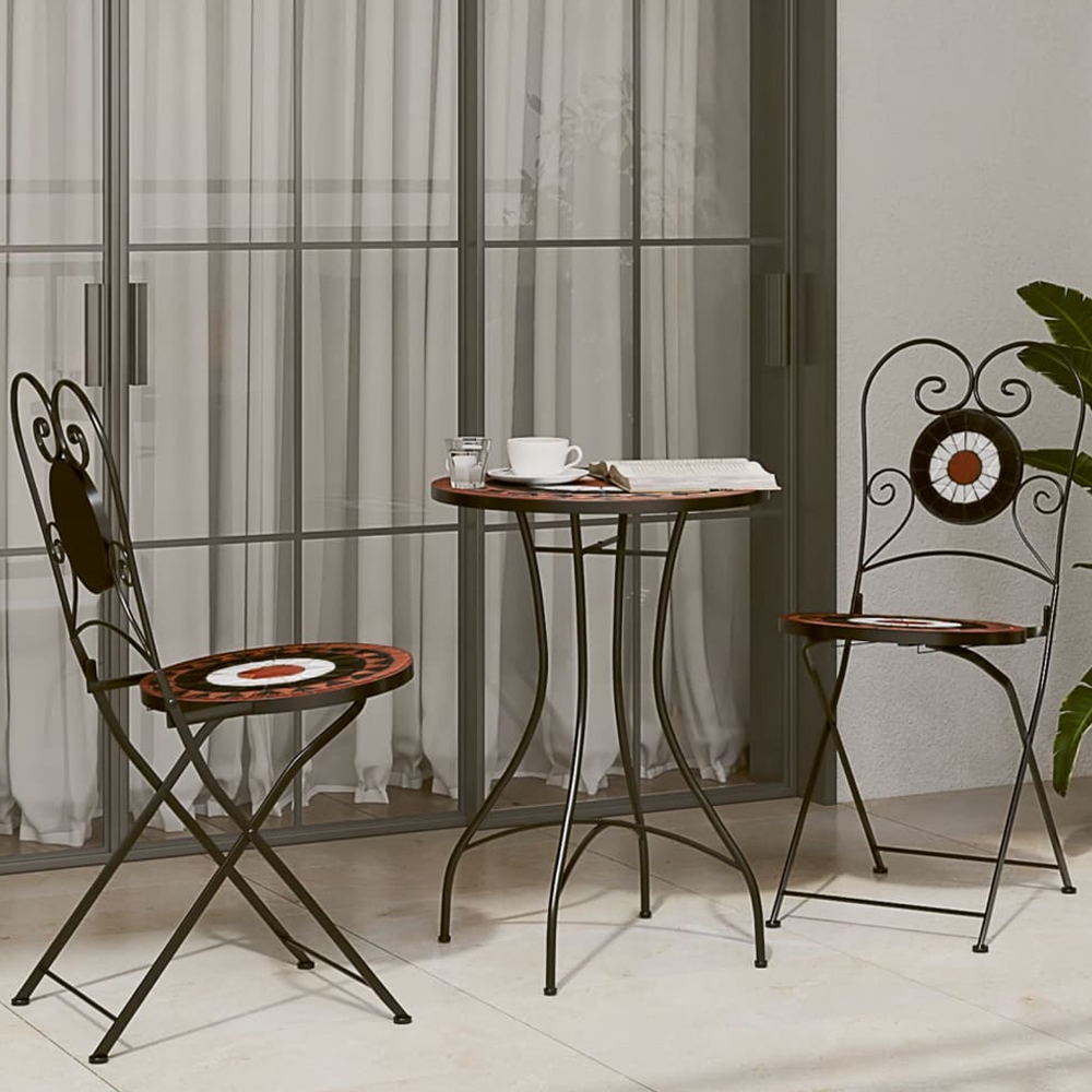 Add warmth and character to your outdoor space with the Furniture in Fashion Etrix Garden Ceramic Top Bistro Set in Terracotta and Black, a stylish fusion of rustic tones and modern elegance. Designed to enhance balconies, patios, and garden corners, this eye-catching bistro set features a rich terracotta and black mosaic pattern that creates a charming Mediterranean-inspired atmosphere. Crafted with a durable powder-coated iron frame and a sturdy ceramic tabletop, this bistro set is built for long-lasting outdoor performance. The smooth ceramic surface is easy to maintain, while the robust metal structure ensures stability for everyday use. Its compact design makes it perfect for smaller outdoor areas, and the foldable chairs offer convenient storage and flexibility when not in use. The Furniture in Fashion Etrix Garden Ceramic Top Bistro Set in Terracotta and Black offers a perfect balance of durability, style, and space-saving functionality. Its sturdy construction and elegant mosaic design make it an ideal choice for creating a cosy and stylish outdoor seating area. FEATURES: Material: Powder-Coated Iron Frame, Ceramic Finish: Terracotta, Black Set Include: 1 x Table, 2 x Bistro chair Enjoy a cup of coffee or have a chat with your family and friends in the garden, backyard, or on the balcony with this mosaic bistro set Stable and easy-to-clean tabletop: This garden table has a ceramic top that is sturdy, durable, and easy to clean with a damp cloth Robust and stable frame: The powder-coated iron frame ensures that the bistro table and chairs are strong and stable for daily indoor or outdoor use Foldable design: The bistro dining chair can also be folded to save space when not in use Mosaic design: The balcony set helps create a Mediterranean atmosphere in your indoor or outdoor settings with its mosaic design Good to know: To make sure your outdoor furniture stays beautiful, we recommend protecting it with a waterproof cover Features a stunni
