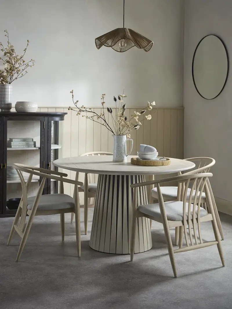 Ideal for adding a touch of neutral impact to a smaller space, our Evora Dining Table features a singular, wide leg, built of geometric triangles to create a focal point in your kitchen or dining space. Handcrafted from a blonde elm, this circular dining table is the perfect addition to our New Neutral trend.
