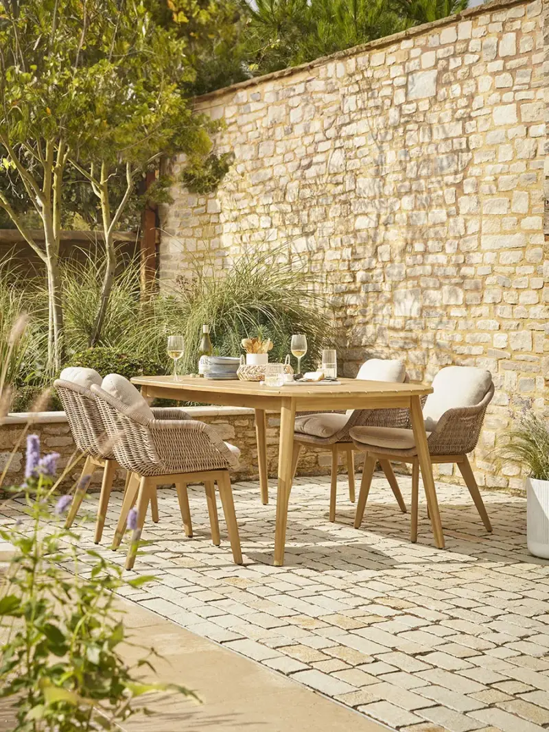 Rich honey toned natural acacia wood adds vitality to this versatile rectangular outdoor dining table. The slatted top comes with an additional central panel allowing the table to be extended to suit larger parties. Perfect for outdoor dining throughout the year, the table is completed with gently splayed legs for a pared back look which will sit happily in any outdoor space. It is designed to pair with any of our acacia wood dining chairs