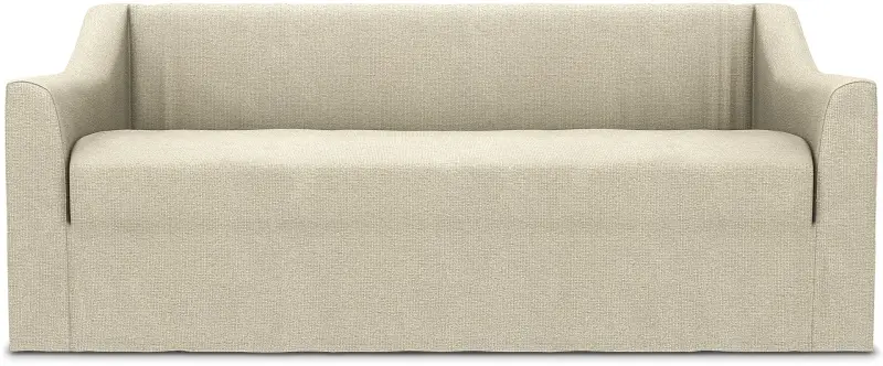 This style includes 1 piece and it’s designed to only fit the IKEA Färlöv 2 seater sofa. This model features one cover for the entire sofa, including the sofa frame and seat cushion / bench cushion. The cover envelopes the seat cushion, the fabric is tucked around the seat cushion and fastened along the backrest frame and armrests with velcro for a neat finish. The backrest features extra padding for added comfort. This look is designed for a pared back minimalist look, covers for the backrest and lumbar cushions are not included for this style. Fitting instructions: Remove the original covers along with the backrest and lumbar cushions, the seat / bench cushion can remain on the sofa. Drape the cover along the backrest and over the armrests. Gently pull the cover over the sofa frame. The cover is designed for the perfect neat fit, so adjust both sides of the backrest and armrests simultaneously. Adjust the seams of the cover so that they are aligned with the armrests and along the centre of the backrest. Smooth the backrest padding to avoid any bulking and to ensure that it lies flat against the back of the sofa. To secure the seat cushion, lift the seat cushion slightly, wrap and tuck the fabric around the back and sides of the seat cushion - creating an envelope or pocket for the seat cushion. The seams of the seat cover section align with the corners of the seat cushion. Velcro is attached to the sofa frame to keep the seat cushion and fabric in place. The cover is designed to skim the floor, adjust accordingly to avoid the fabric bunching and for a smooth, neat fitting look. The fabric should be completely smooth when properly attached.