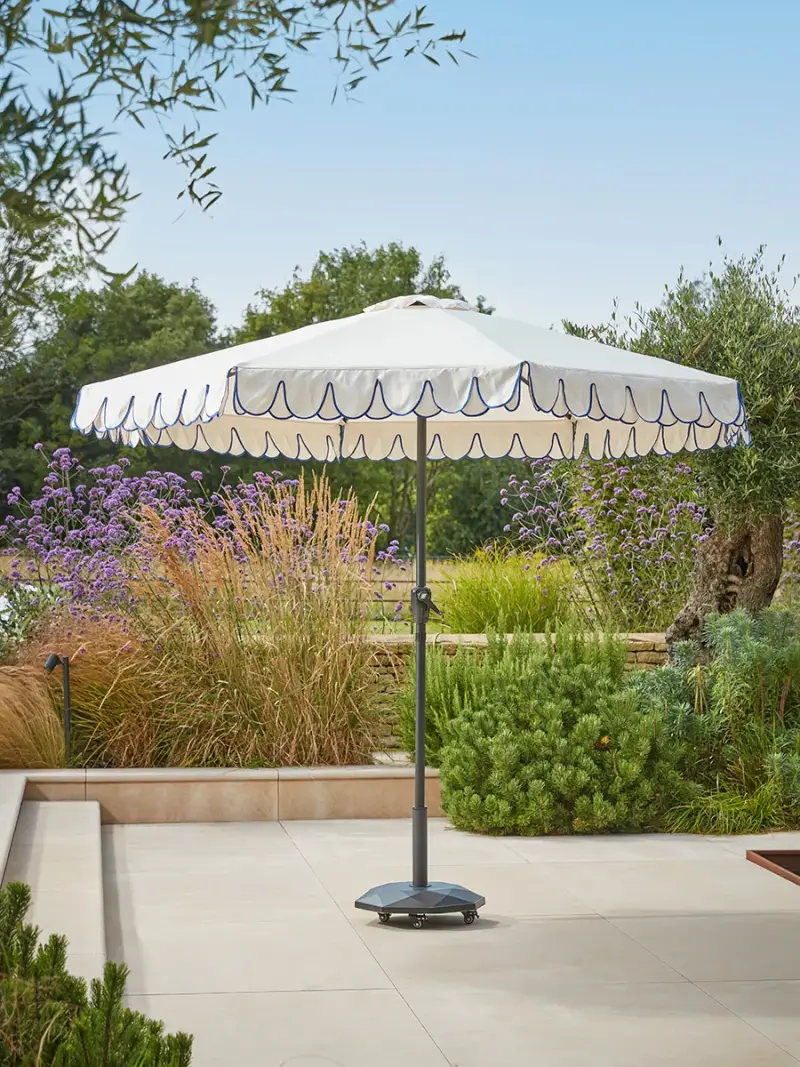 Delicate scalloped edges with a bright blue trim add a wonderful pop of colour to your garden, enhancing the warm summer days in your garden, whilst keeping you cool and collected in the shade.With a generous canopy spanning more than two metres our Fabienne Parasol is ideal for shading outdoor dining tables or your sun loungers. The central pole has a striking black finish, perfect for gardens with a slight modern edge.It should always be teamed with a sturdy base, such as our Geometric Parasol Base (available separately).