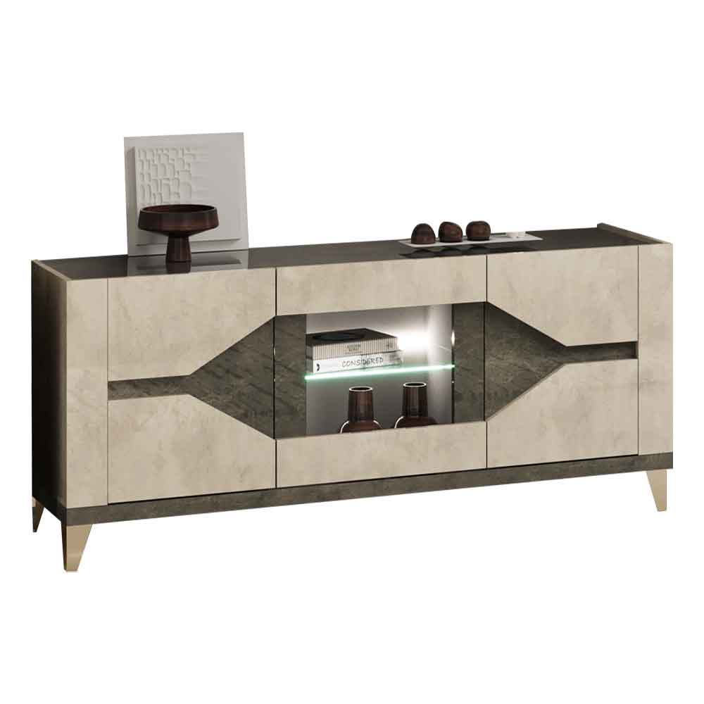 Bring modern elegance and practical storage into your home with the Fabio High Gloss Sideboard with 3 Doors in Warm Grey Marble Effect and LED from Furniture in Fashion. Designed with a luxurious warm grey high gloss finish, this contemporary sideboard adds sophistication and style to any living room, dining room, or hallway. Its sleek geometric front detailing and refined structure make it a standout furniture piece for modern interiors. Featuring three spacious doors and a beautifully illuminated central display section, this sideboard offers the perfect combination of concealed storage and stylish presentation. The integrated LED lighting enhances the open display area, making it ideal for showcasing decorative accessories, books, or glassware. Crafted for both functionality and visual appeal, this sideboard is perfect for keeping your home organised while elevating your decor. FEATURES: Material: Particleboard, Steel, Glass Finish: High Gloss Warm Grey Marble Effect, Dark Grey Sides and front units in particleboard, cloud effect, warm grey finish, gloss polyester varnish Top, back and front decorations made of dark brown iron gres particleboard, coated with polyester gloss finish Champagne-coloured steel feet LED lighting inside the showcases Stylish 3-door sideboard with modern geometric front design Finished in elegant Warm Grey High Gloss for a luxurious appearance Featuring a central open display section for decorative items Integrated LED lighting adds ambient illumination and modern style Spacious concealed storage behind three doors for clutter-free living Ideal for storing dinnerware, books, ornaments, and home essentials Strong and durable construction for long-lasting everyday use Perfect for living rooms, dining rooms, hallways, and lounge spaces Contemporary design combines practicality with premium aesthetics Available at an affordable price Images shown are for illustrative purposes only DIMENSIONS: Height: 87. 5c