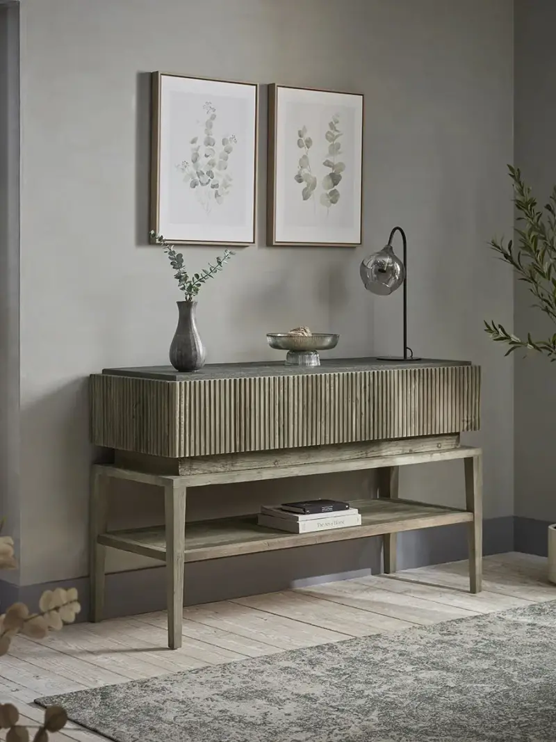 For a storage solution that is sleek and modern, our Farum Console Table is the perfect addition to your home.Cleverly designed, three drawers are concealed within the tabletop behind handle-free fronts of slatted wood which adds to the contemporary feel.A boxy frame supports the drawers and features a low shelf, ideal for displaying your favourite books or accessories.Finished with a natural bluestone top, this console table works wonderfully in a home that celebrates rustic or industrial style.
