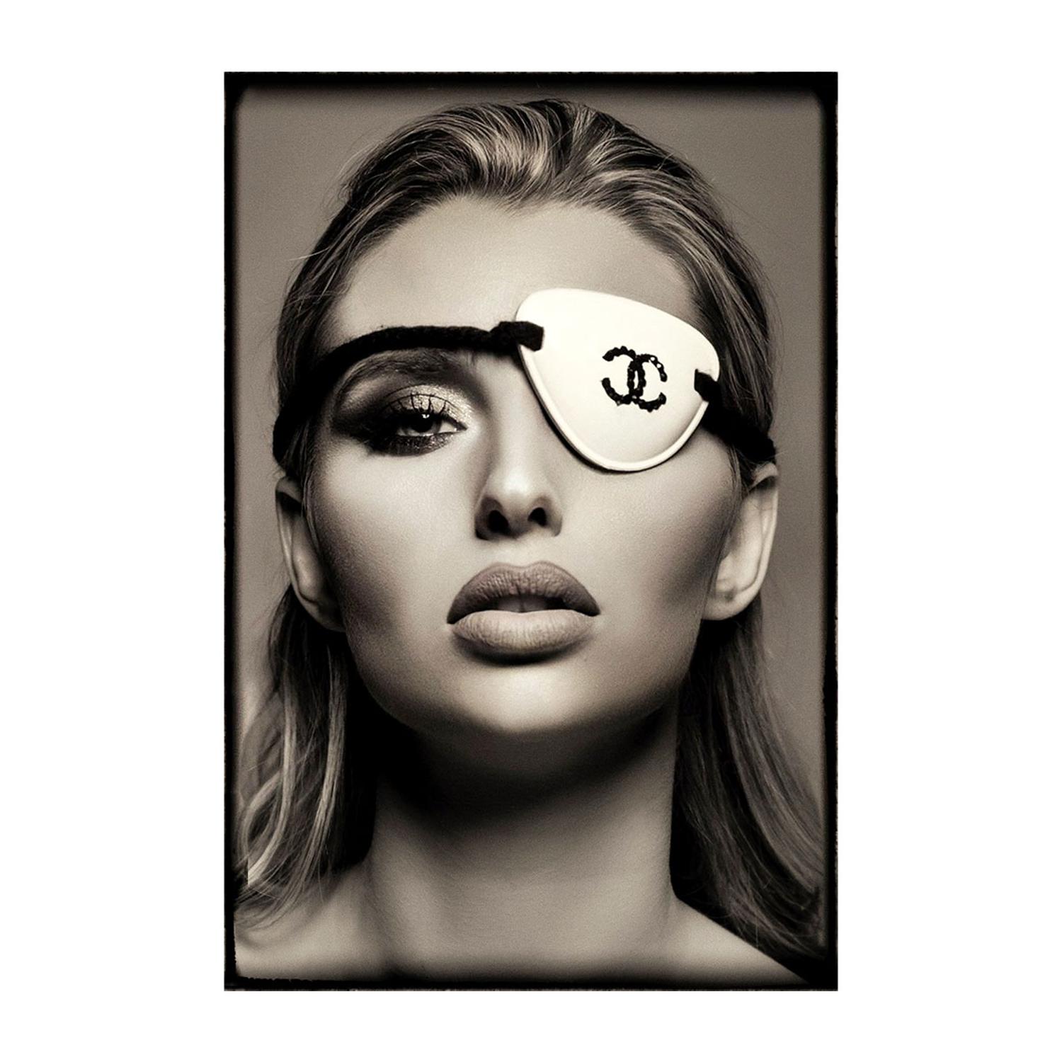 The monochrome colour scheme of this piece brings out the Chanel logo eye patch on the model for a luxury fashion statement. Printed onto smooth plexiglass this artwork has a sleek, glossy finish and is part of our curated collaboration with Cobra Art. Fashion Statement Chanel, Plexiglass Artwork , 100cm x 150cm, Bronze - Andrew Martin