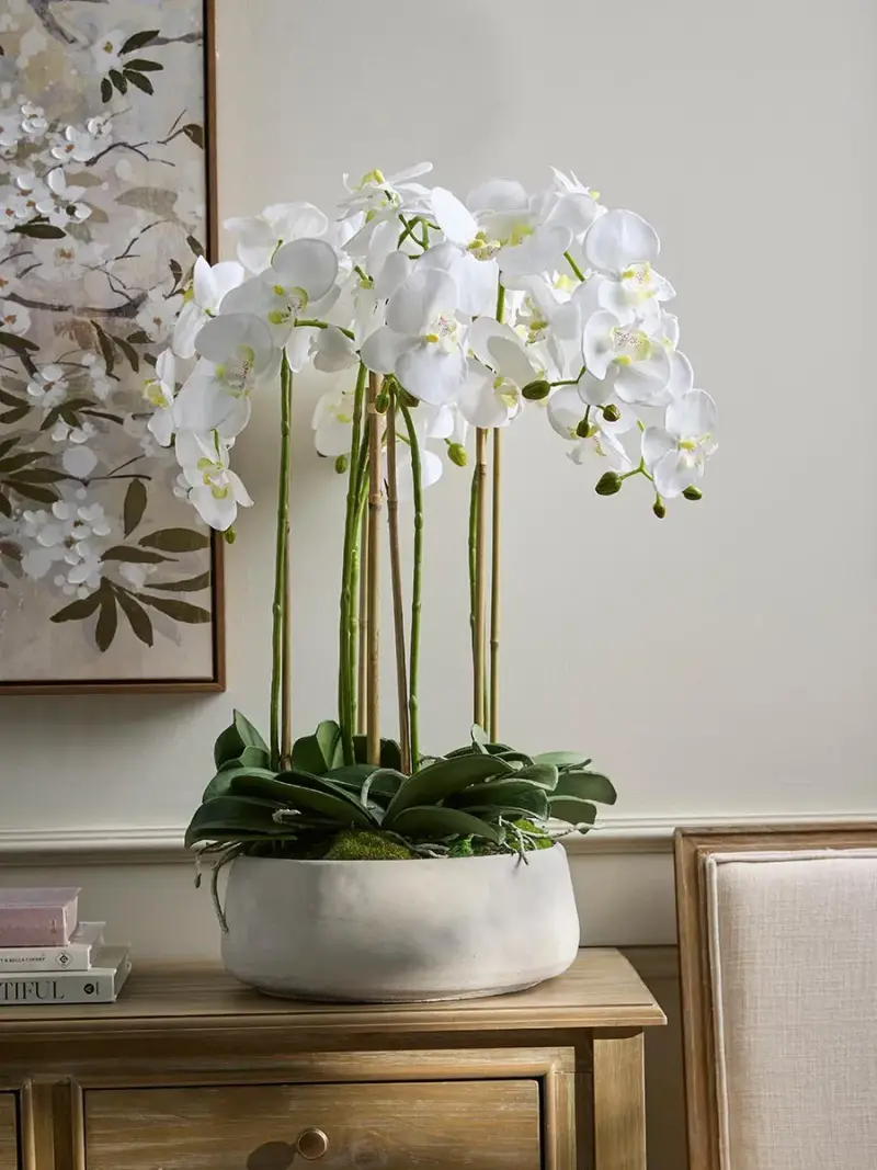 Perfect as a dining room table or kitchen island centrepiece, this large faux orchid features incredible attention to detail that ensures these artificial blooms both look and feel realistic.With a variety of open blooms and buds and authentic looking root networks, this artificial orchid is presented in a large stone pot.